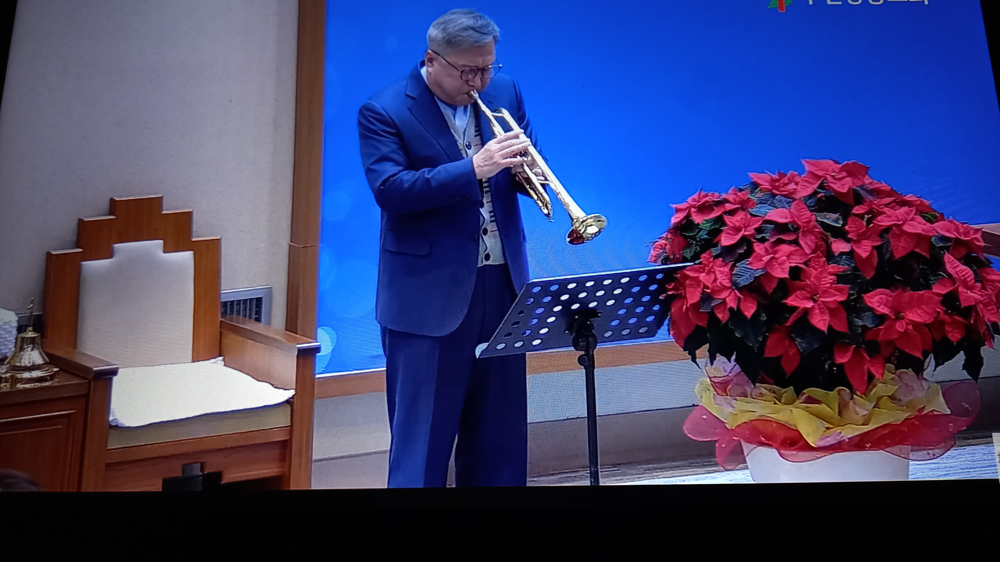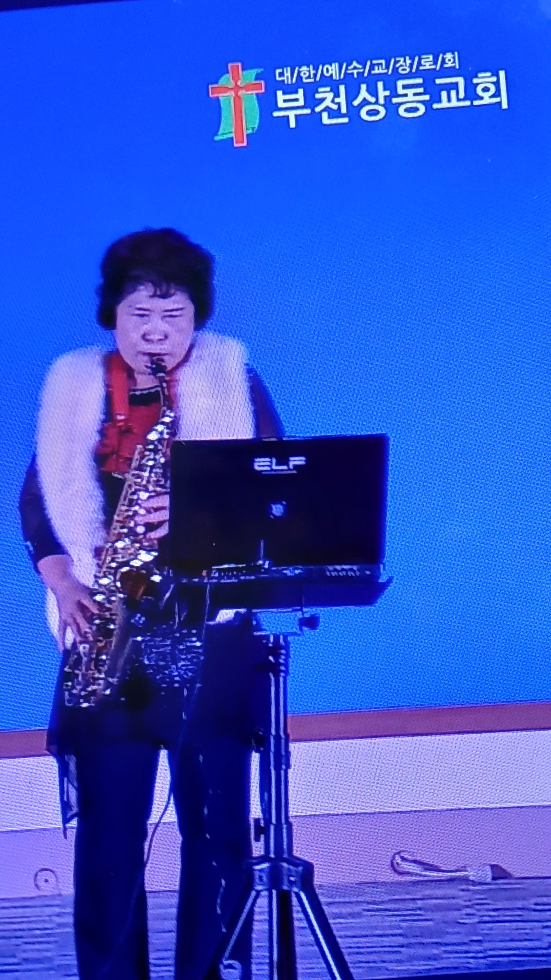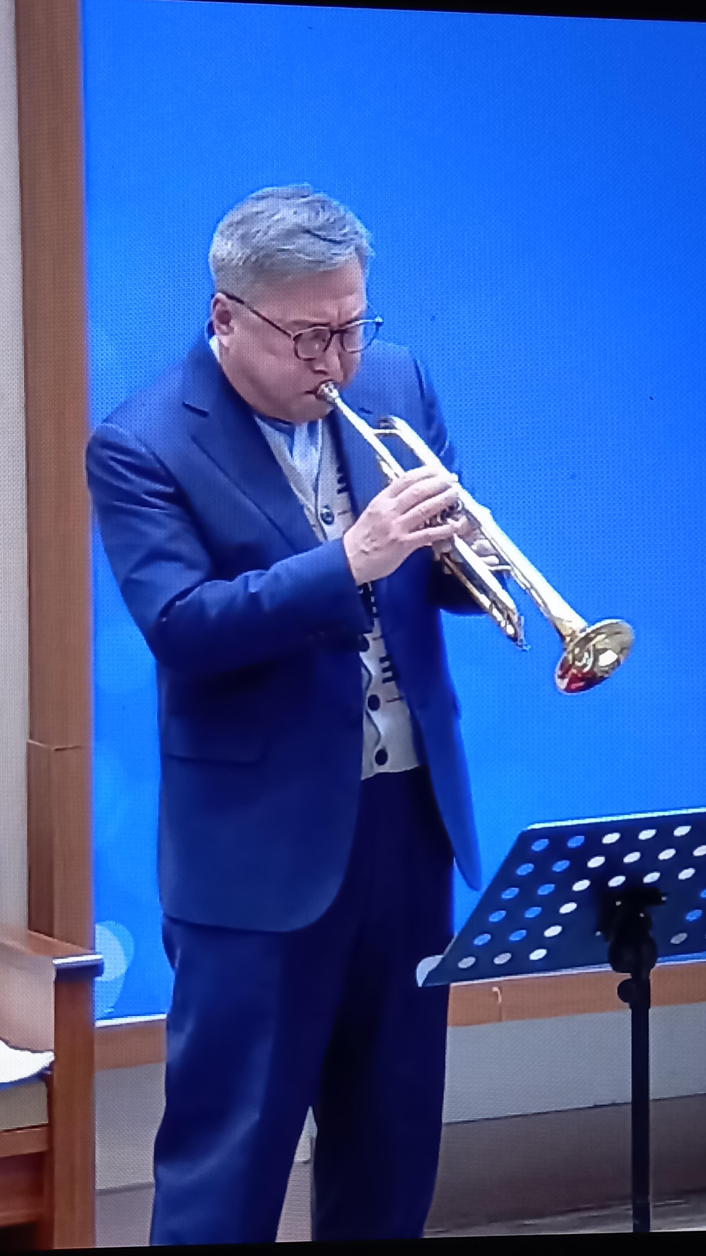 설교 말씀 후 악기로 연주하시는 모습이